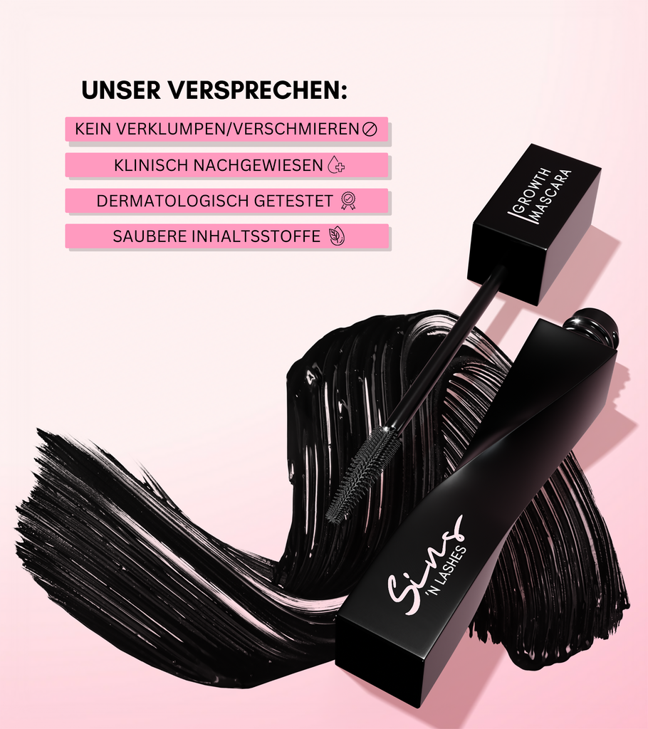 Außerdem sollte die Sins 'n Lashes Vitamin Growth Mascara nur unter Aufsicht eines Arztes verwendet werden, wenn man sich in Behandlung einer Augenerkrankung befindet. Außerhalb der Reichweite von Kindern aufbewahren. Wir empfehlen, dass die Hände und das Gesicht vor der Anwendung mit milder Seife und Wasser gewaschen werden.